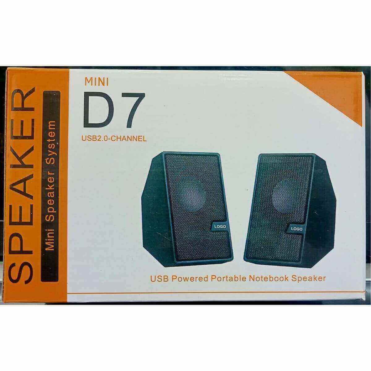 D7 multimedia speaker is ideal for PC, mp3, mp4, and laptops, providing adaptable sound with unique tone levels. It also features a 2.0-channel in mini speaker system with 3D sound technology.